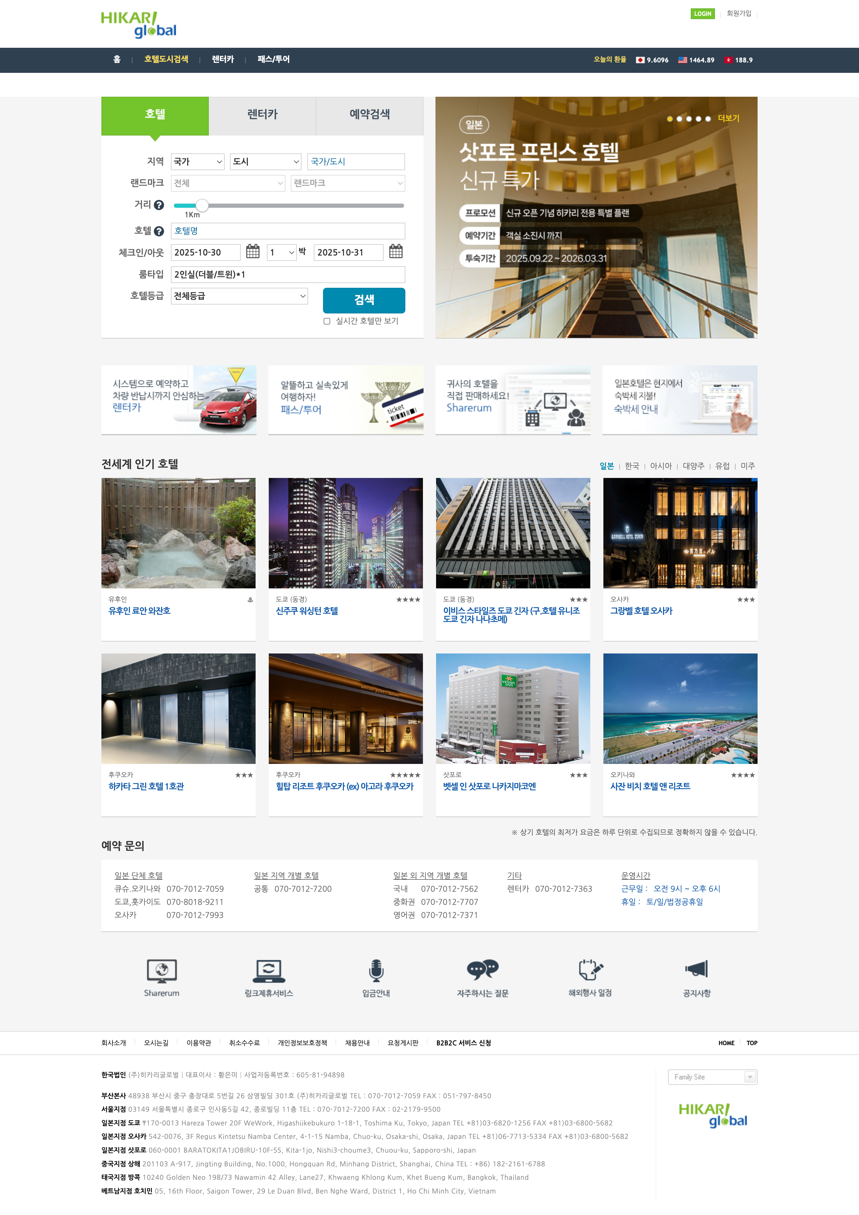 히카리는 자체 개발 시스템을 통해 호텔·렌터카·관광상품 등다양한 목적지 콘텐츠를 API로 실시간 연동합니다.한국, 일본, 동남아 등 아시아 주요 여행지는 물론 글로벌 파트너와의직거래 호텔 네트워크를 기반으로 한층 폭넓고 경쟁력 있는상품 구성을 경험하실 수 있습니다.